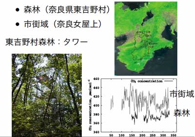 共生科学研究センターでは、土壌内微生物の呼吸に関する研究や大気中の二酸化 炭素の濃度の連続測定が古川教授によって行われています。センターではこれらのデータを総合的に解析することにより、人間活動 によるエネルギー消費量に対して植生が吸収でき る二酸化炭素の量がどのくらいであるのかという植生の果たしている役割を定量化し、共生循環型社会の構築を考えていくために信頼のおけるデータを提供していたいと思います。