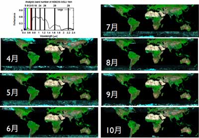 植生の成長量の調査は、全世界的な取り組みで1960〜1980年に行われました。このデータを基にいくつかの気候的なモデルが作られ、気温や湿度の観測データを用いて、植生の二酸化炭素吸収量が推定されてきました。しかしこれらのモデルには、現実の植生の分布やその活性度が反映されているわけではありません。近年の技術開発により、人工衛星による地球観測が行われています。台風の際、雲の様子をよく捉えているひまわり衛星の画像は非常に身近なものとなってきています。これら人工衛星のデータ解析により、地球上の植生の分布やその活性度が観測できるようになりました。