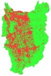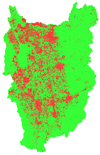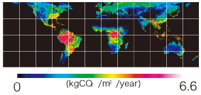 共生科学研究センター協力研究員である熊彦氏の学位論文では、2002年12月に日本の宇宙開発機構によって打ち上げられたみどり2号に搭載されたGLI(グローバル・イメージャー)によって観測されたデータからいかに植生の活性度を抽出するかを研究し、その手法を用いて、陸域の純一次生産量を推定しました。 図は、陸域の植生純一次生産量の分布を示します。この解析から全地球での1年間あたりの純一次生産量は炭素量に換算して66.5+- 17.3( PgC )と推定されました。