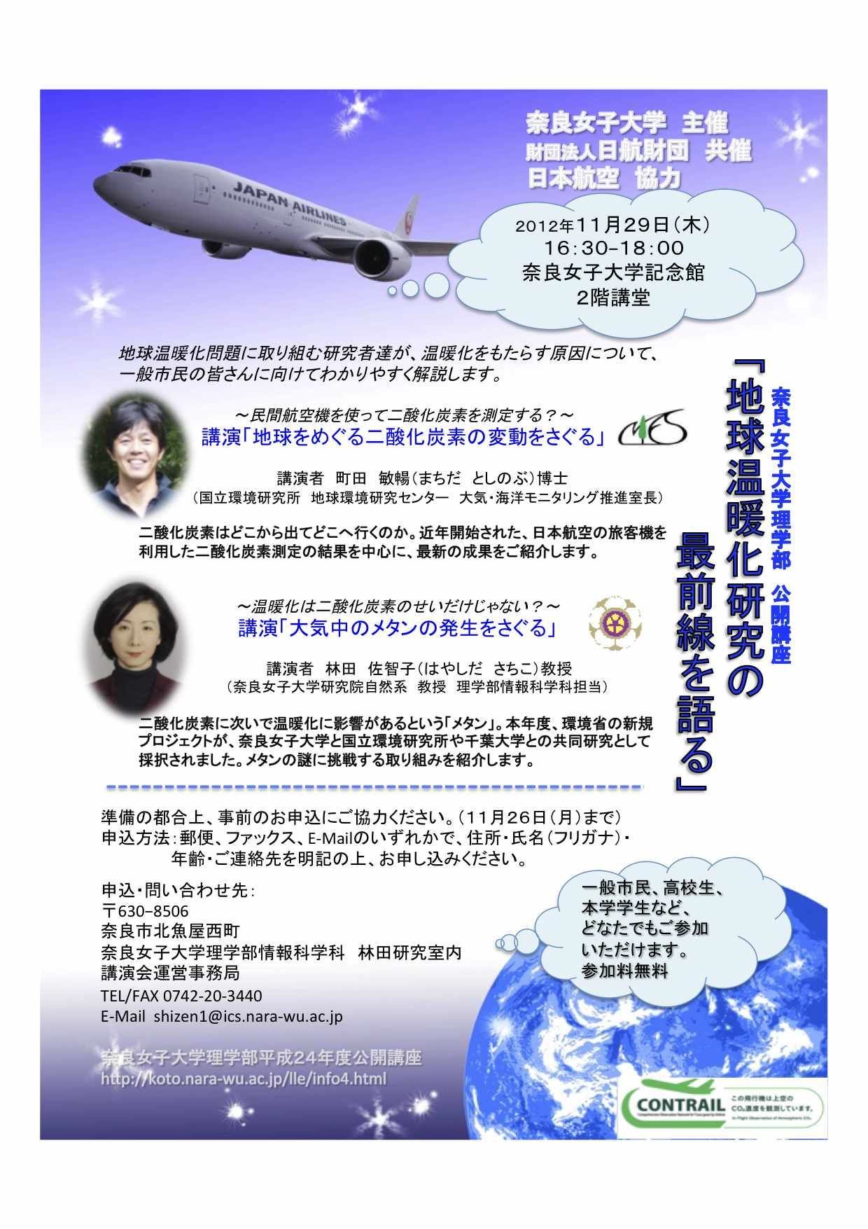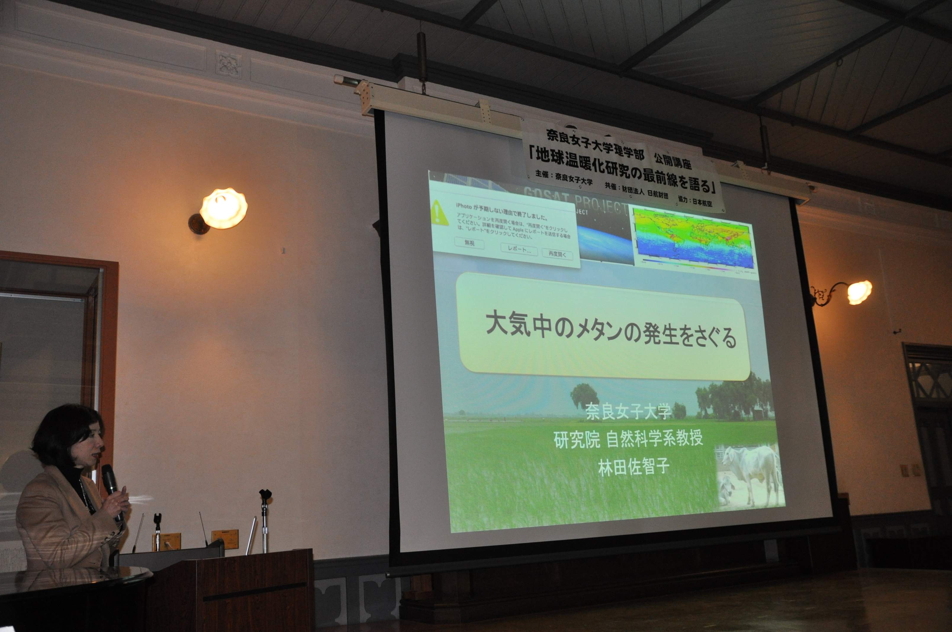 環境問題に関心のある方々が参加され、町田博士、林田教授に、普段疑問に思っていることを質問していました。南極の氷の中に昔の空気が保存されていたこと、航空機観測による二酸化炭素の測定の話、また、二酸化炭素だけでなくメタンも重要な温室効果ガスであることなど、非常に興味深い講演会でした。